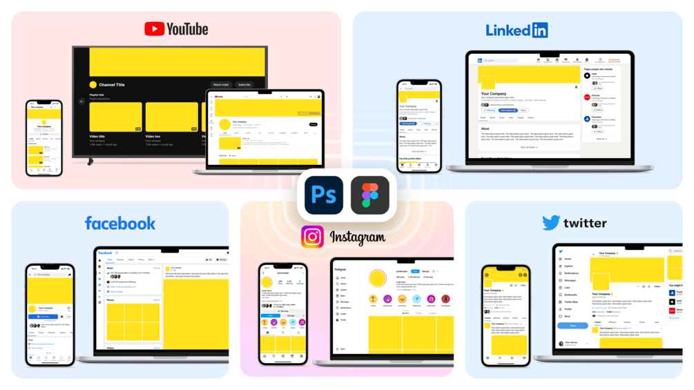 Boost your productivity and show-off your design work with eye-catching Social Media branding mockups. With these Photoshop and Figma files kit you'll save tons of time while batch-creating multiple visuals at once.