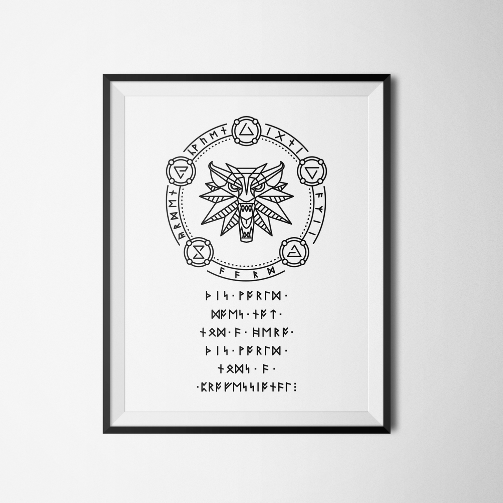 The runes in it is from Tolkien's LOTR. Inside the circle, the runes is meant to be the signs names: aard, igni, quen, axii and yrden.
