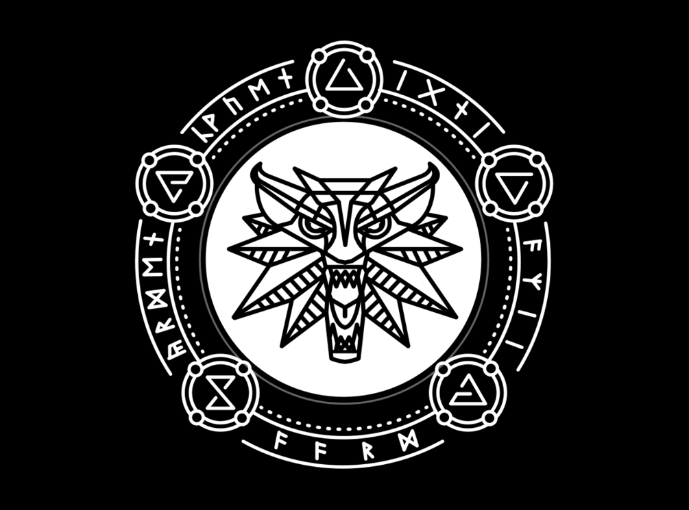 The runes in it is from Tolkien's LOTR. Inside the circle, the runes is meant to be the signs names: aard, igni, quen, axii and yrden.