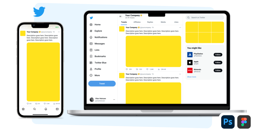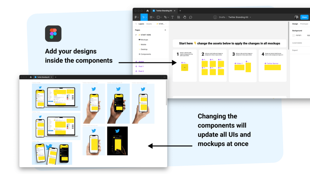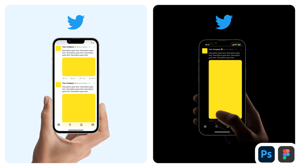 Boost your productivity and show-off your design work with eye-catching Twitter branding mockups. With these Photoshop and Figma files kit you'll save tons of time while batch-creating multiple visuals at once.