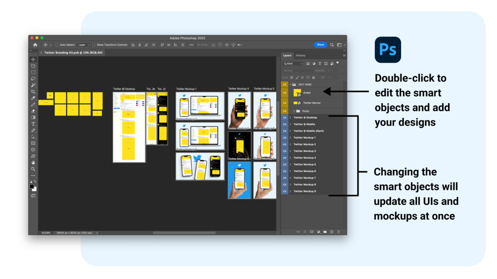 🔥 Show-off your design work with eye-catching Twitter branding templates. With these Photoshop and Figma files kit, you'll batch-create visuals in no time.